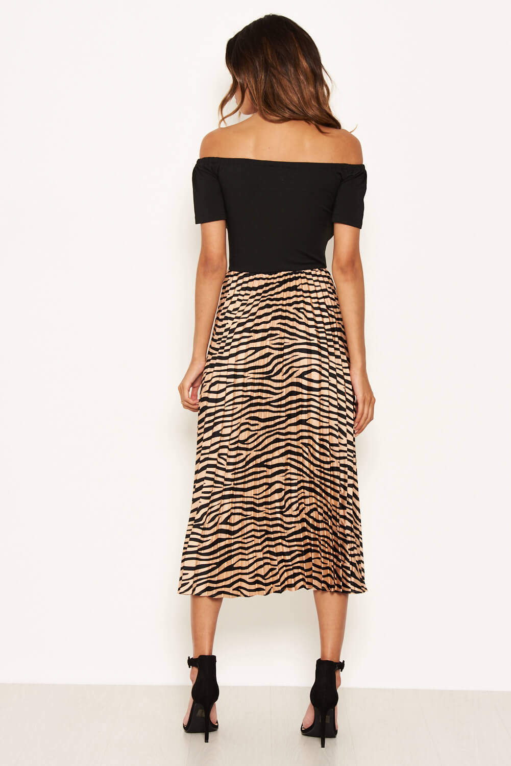 zebra print pleated skirt and a black bardot top this dress is super